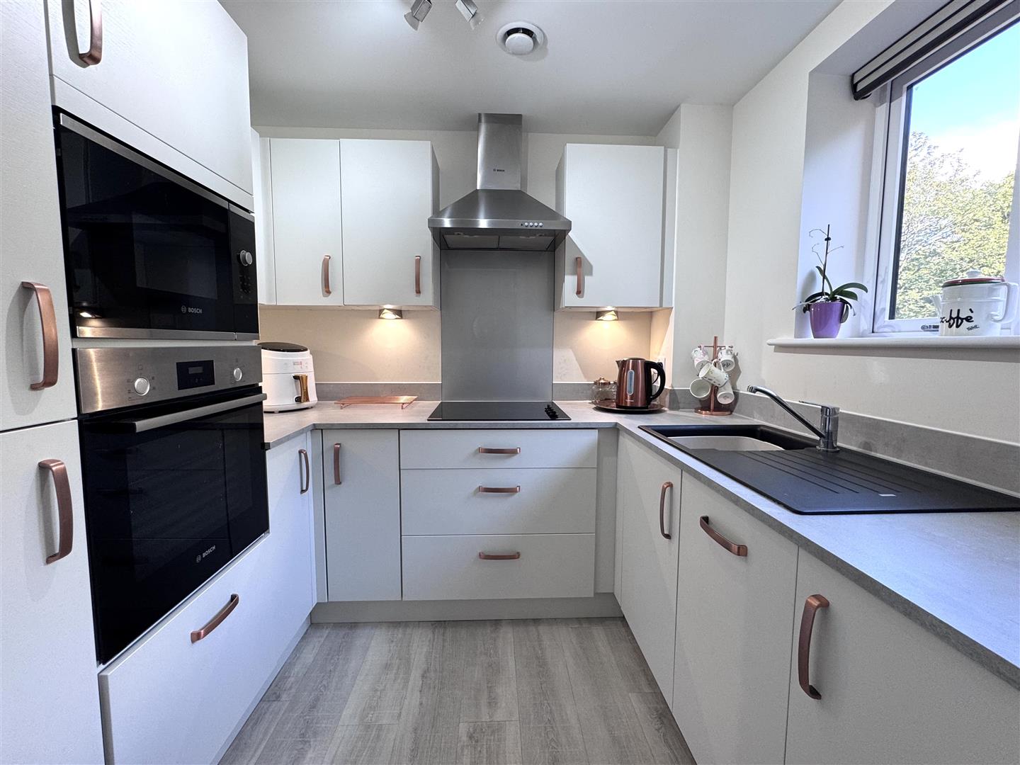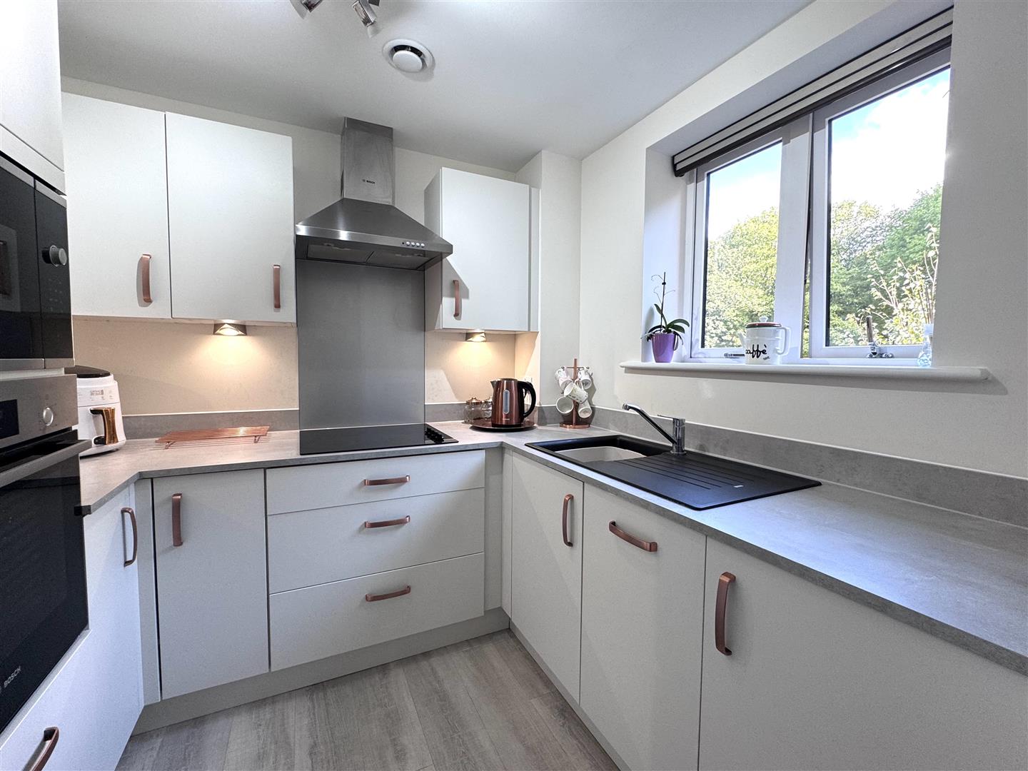 The modern kitchen is thoughtfully designed and well equipped, featuring a range of fitted units complemented by integrated appliances, providing both a sleek appearance and practical functionality. Well planned storage and worktop space make the kitchen ideal for day-to-day use, while remaining easy to maintain.